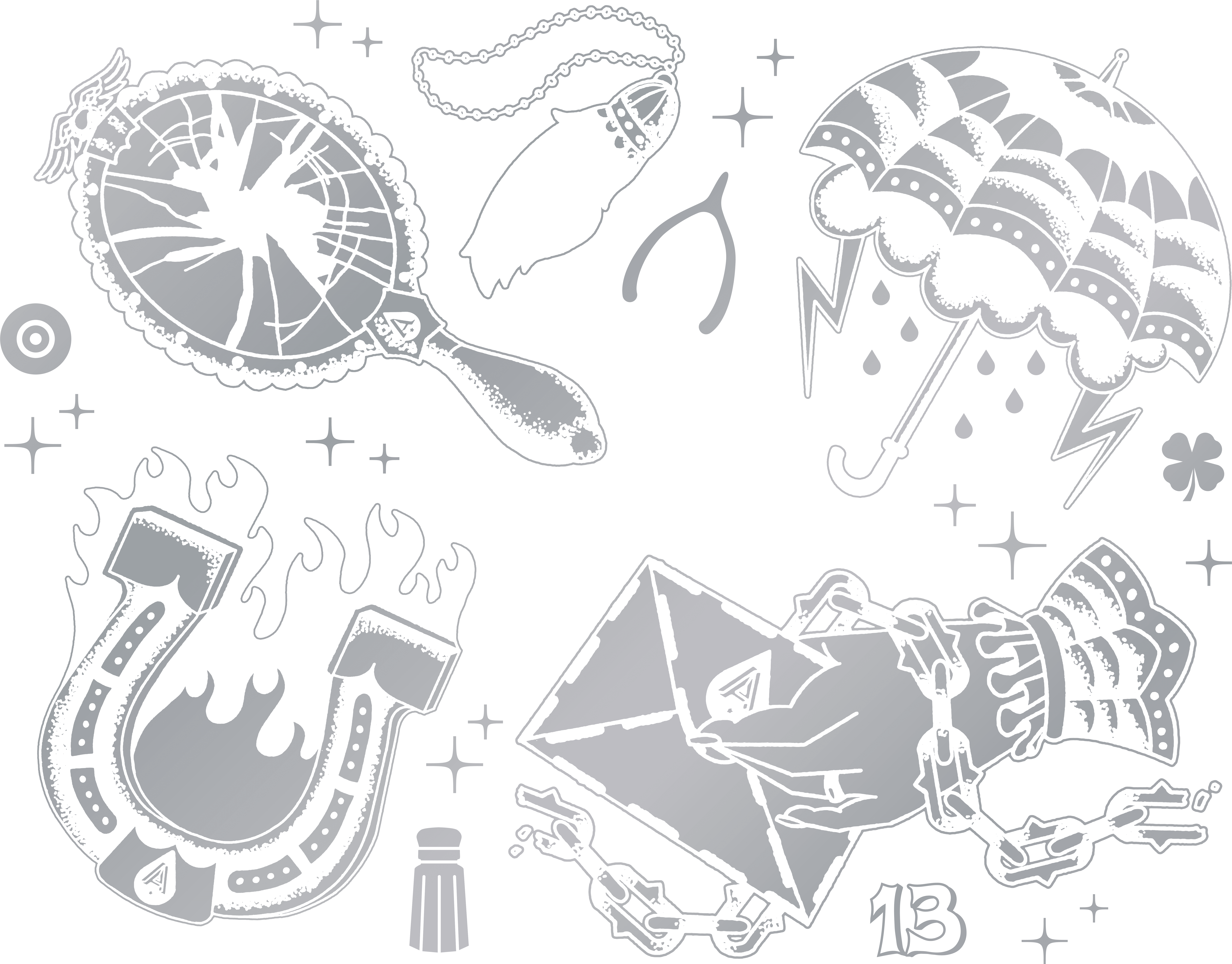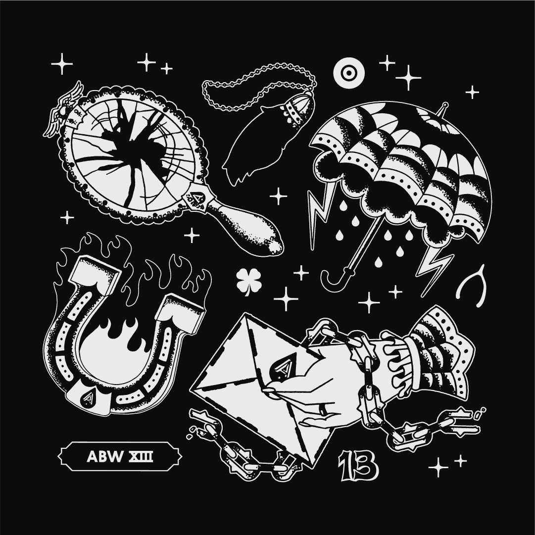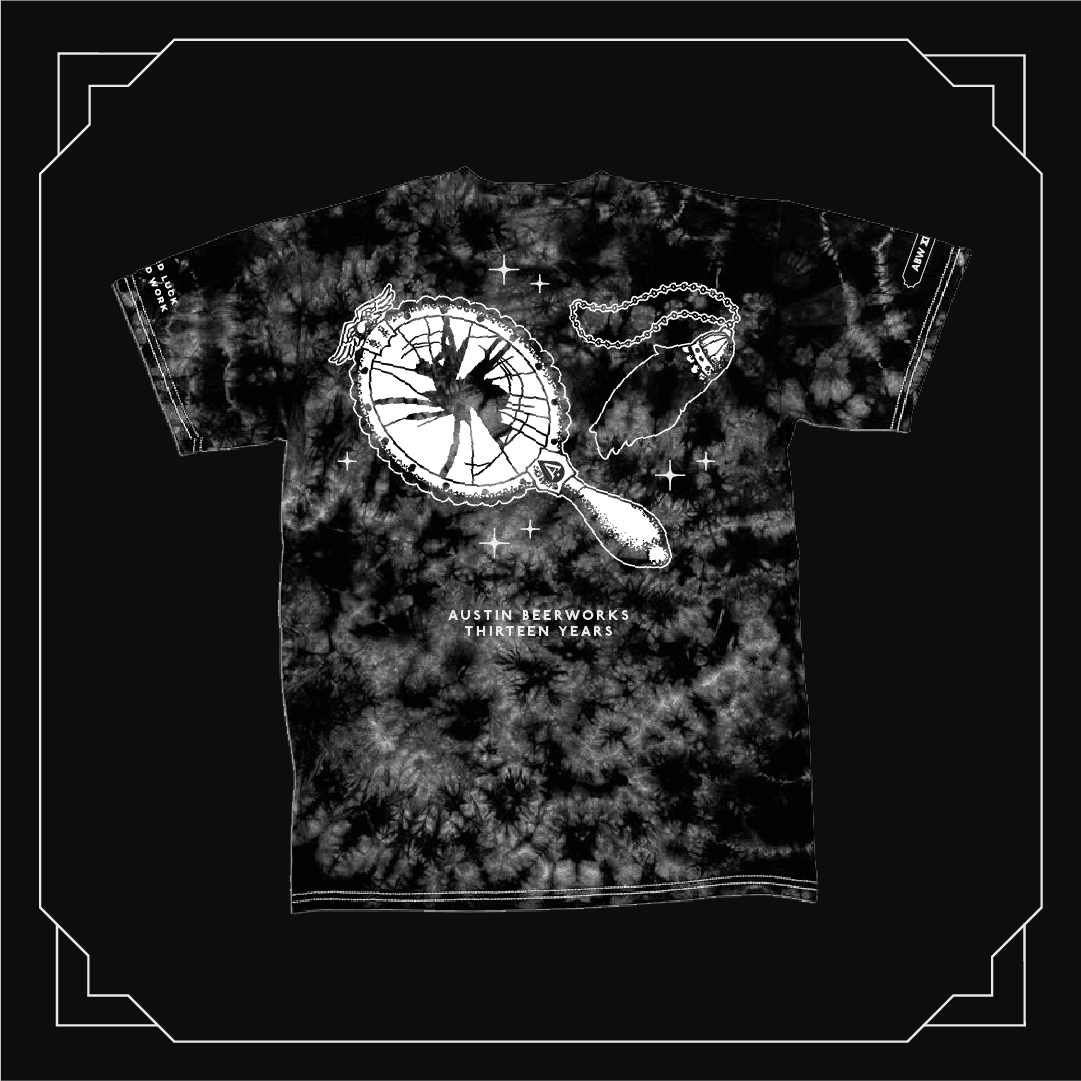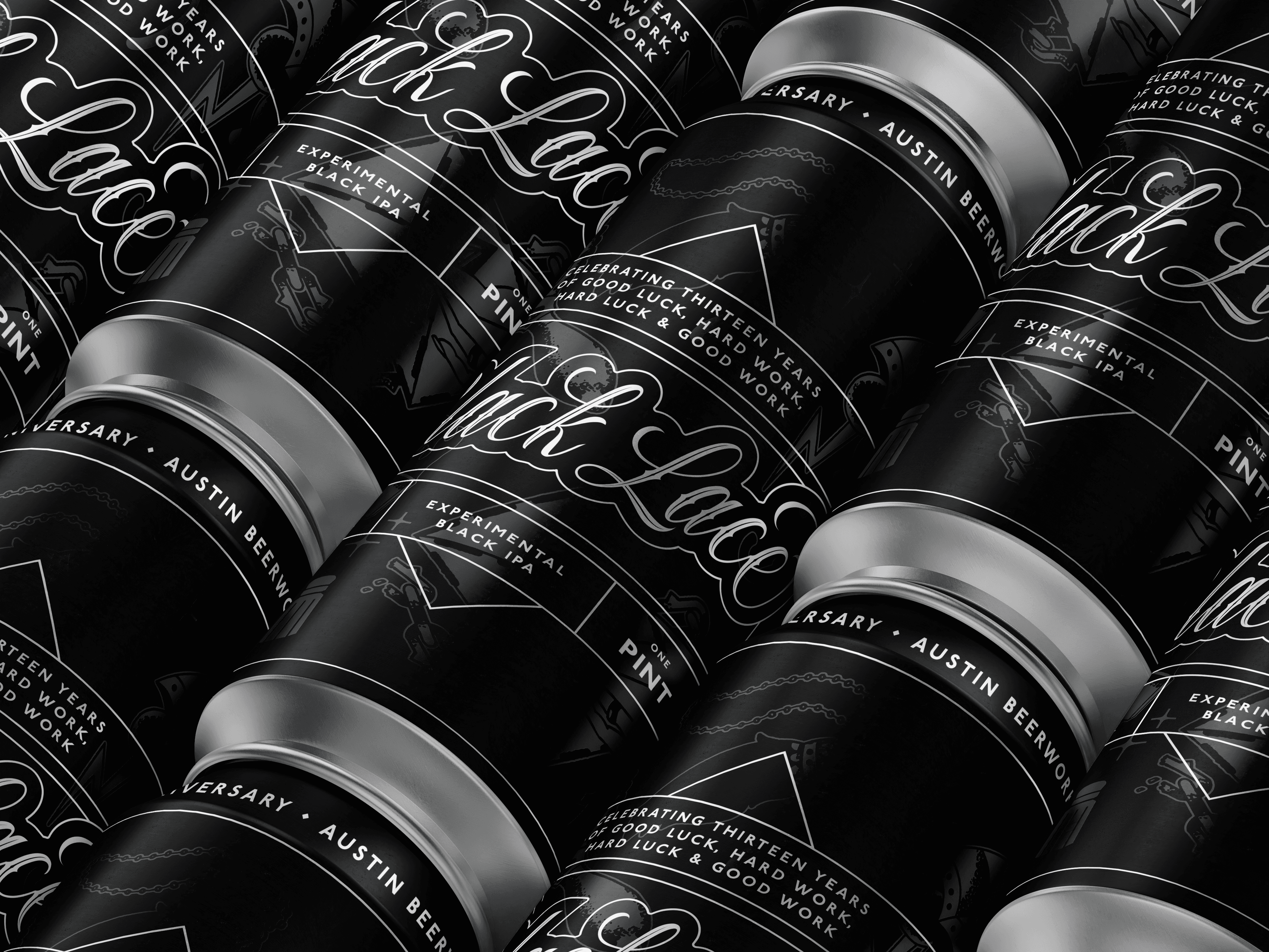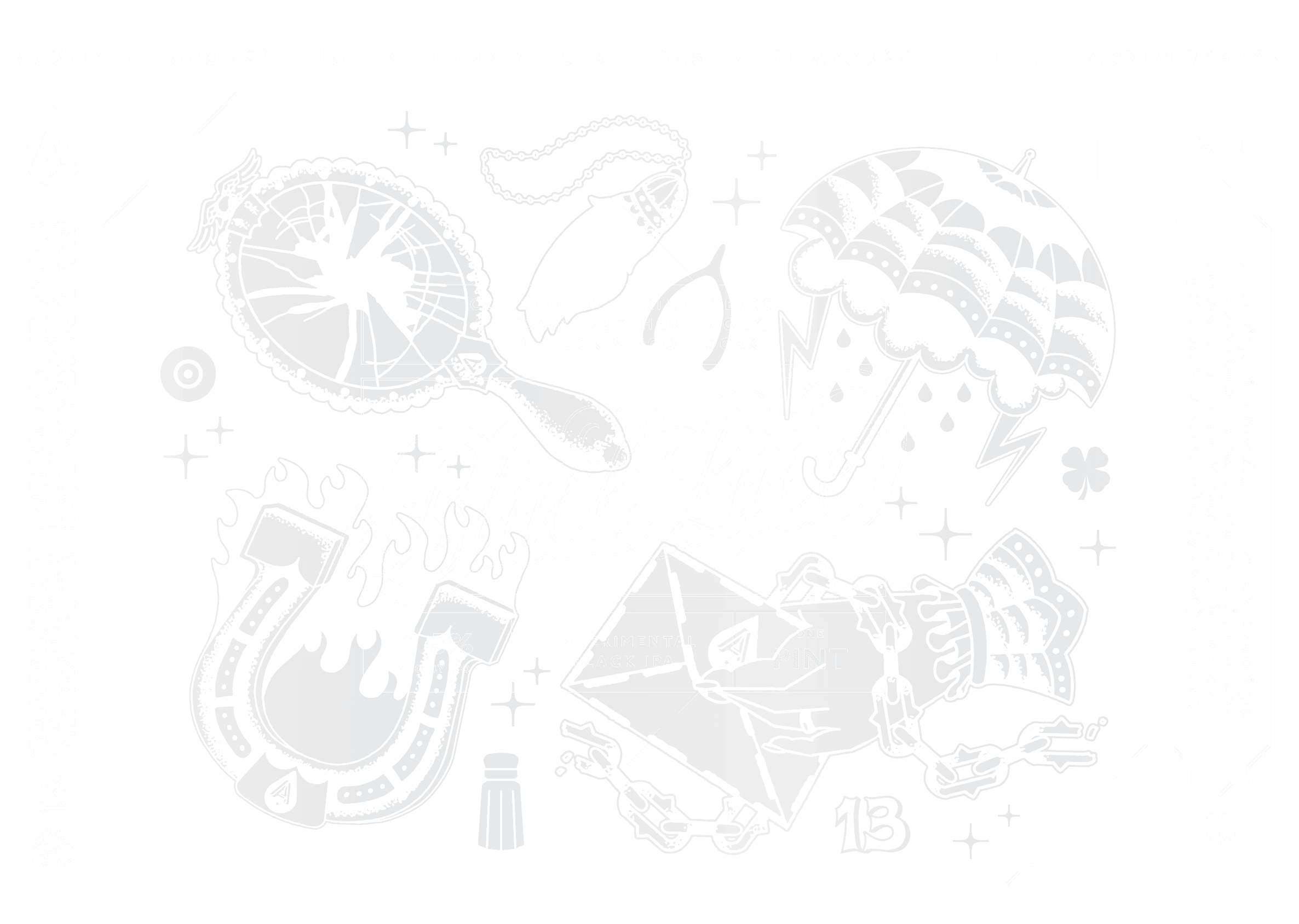 To celebrate their thirteenth anniversary, Austin Beerworks brewed up an Experimental Black IPA that called for an experimental black can design. The number thirteen conjured up some tattoo-centric imagery, so we whipped up several custom illustrations that were applied to the can as low contrast metallic finishes.